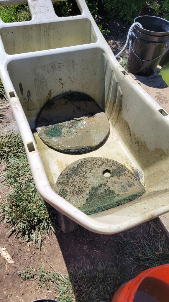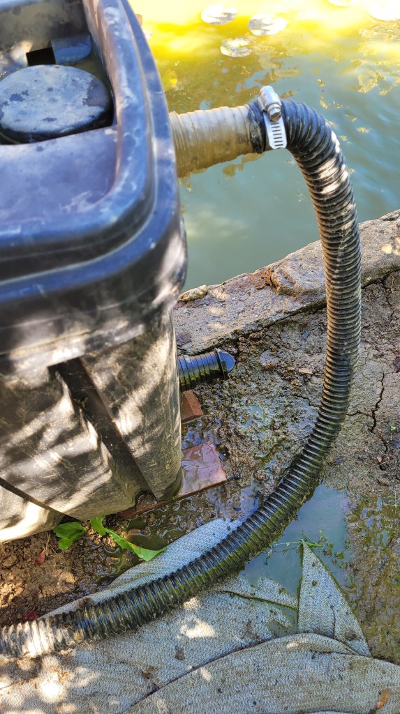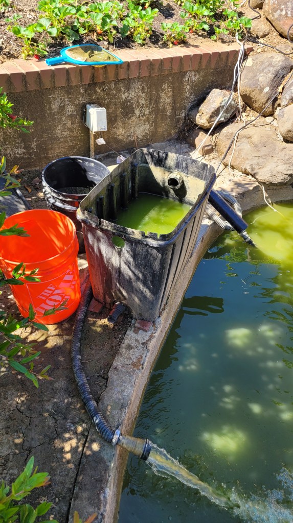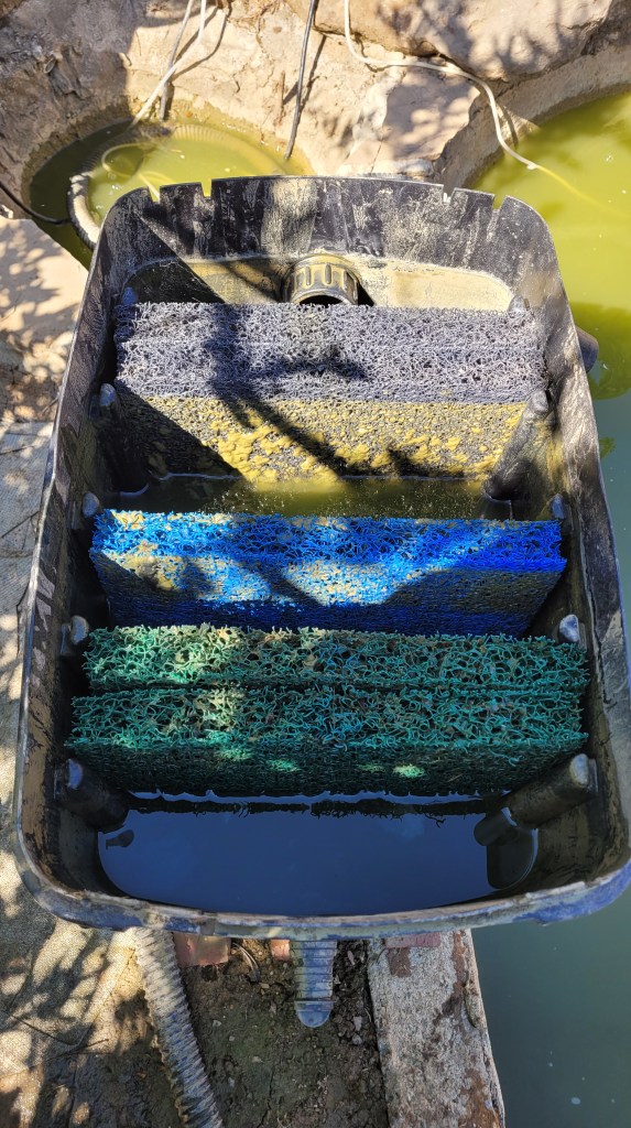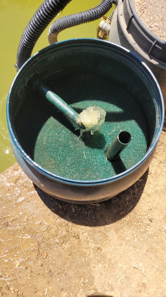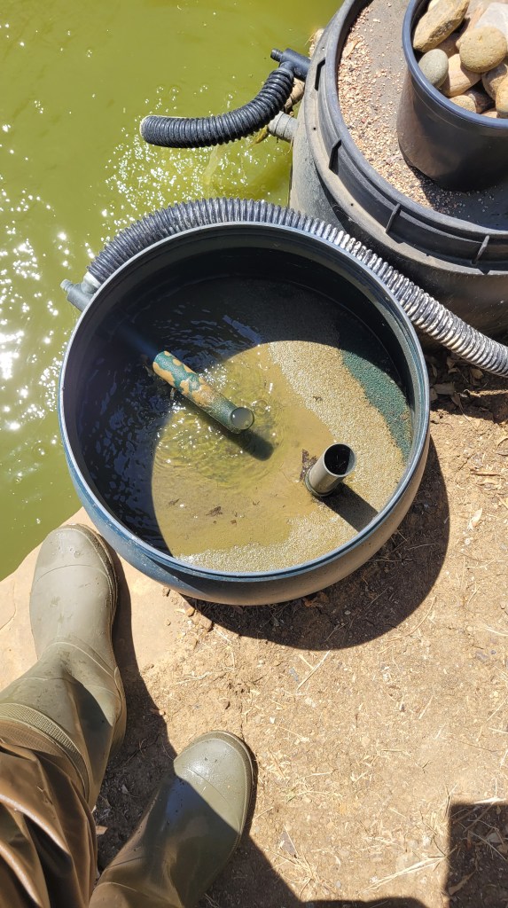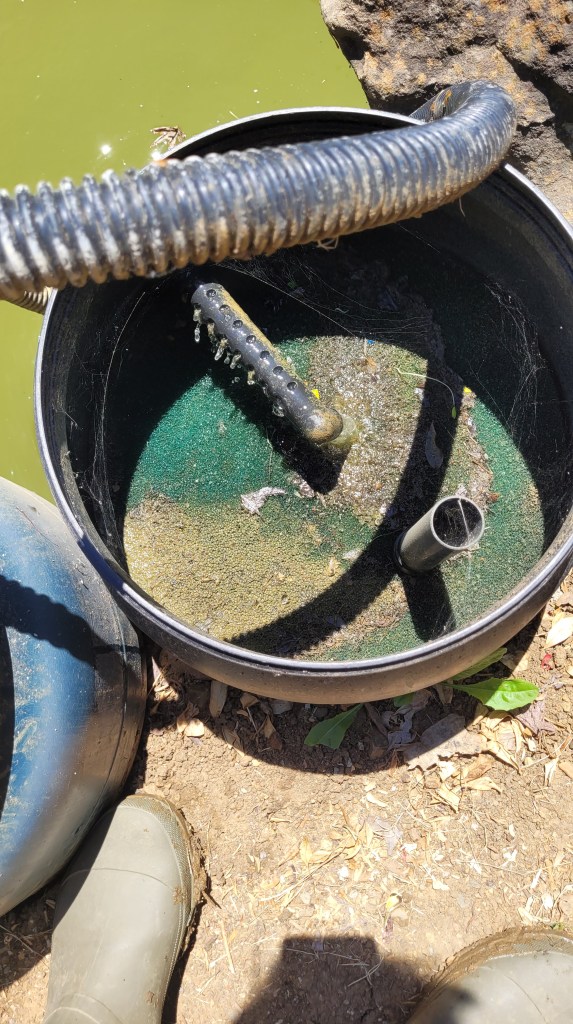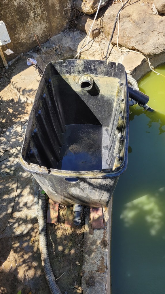 My backyard pond has three biofilters that I connected to a single water pump in a Frankenstein like fashion with pipes everywhere. It works for my purposes and keeps the fish from poisoning themselves, but the main issue is sludge build up if I don’t clean it out. So I did.