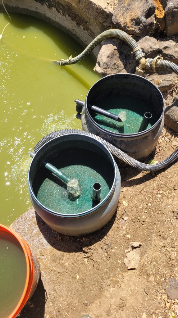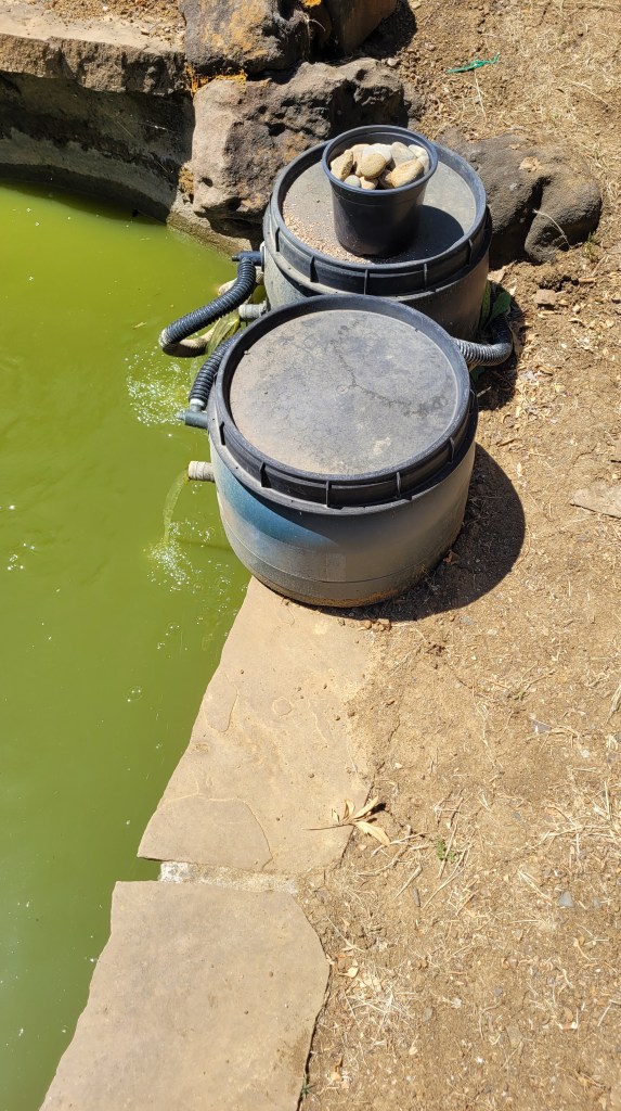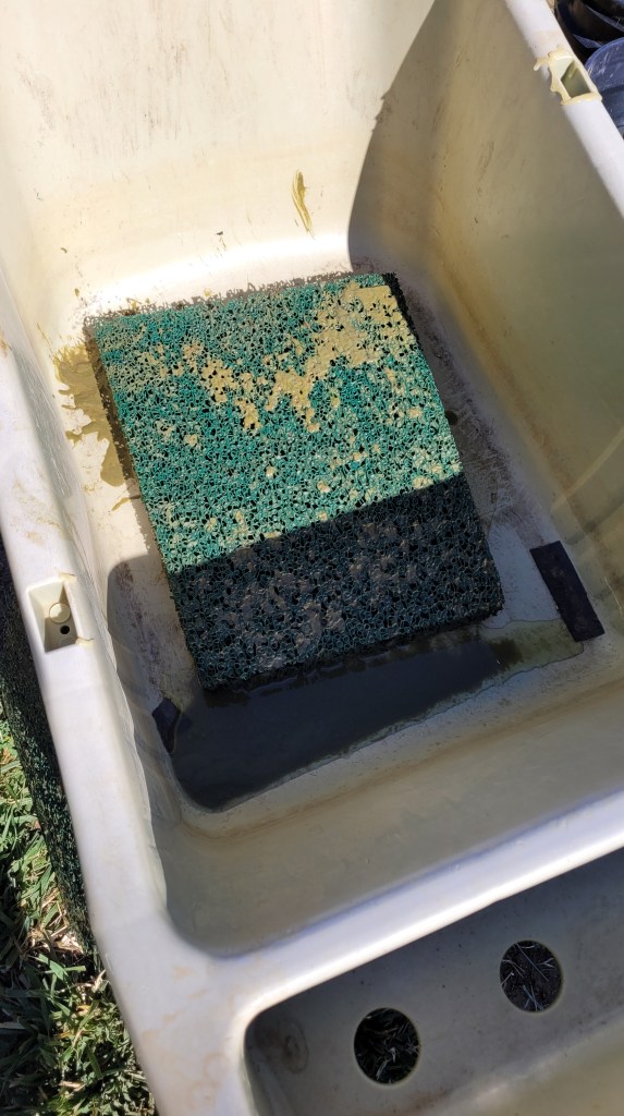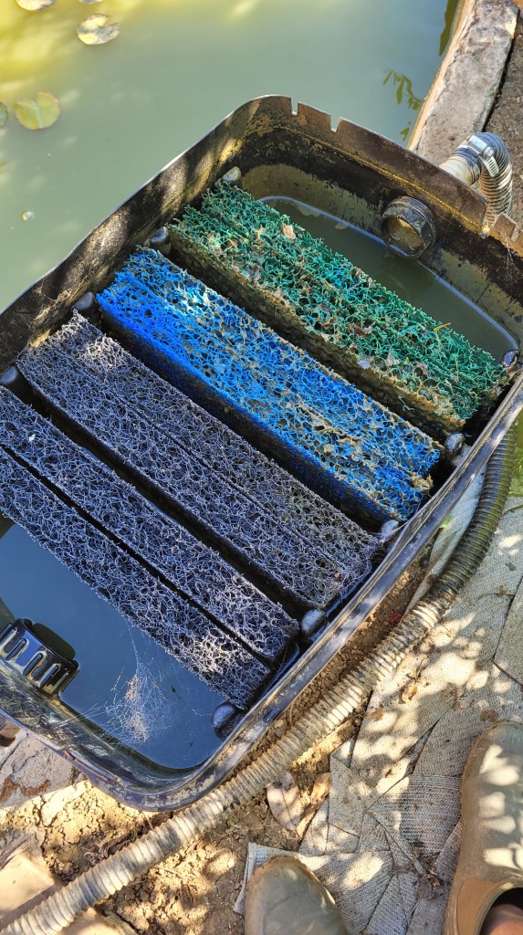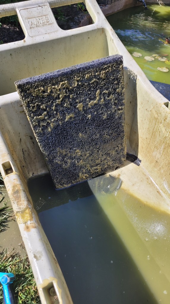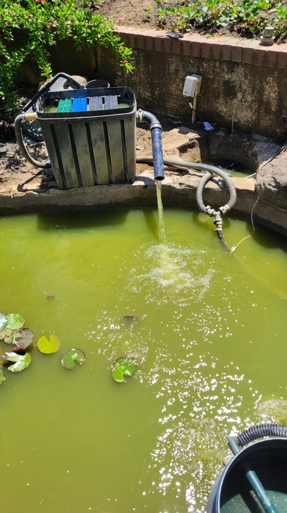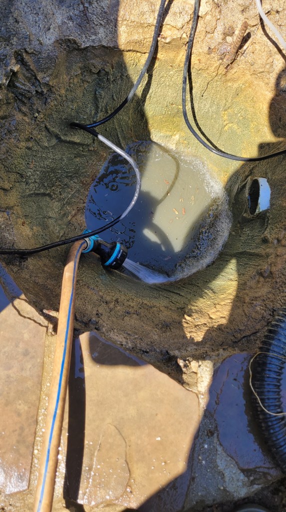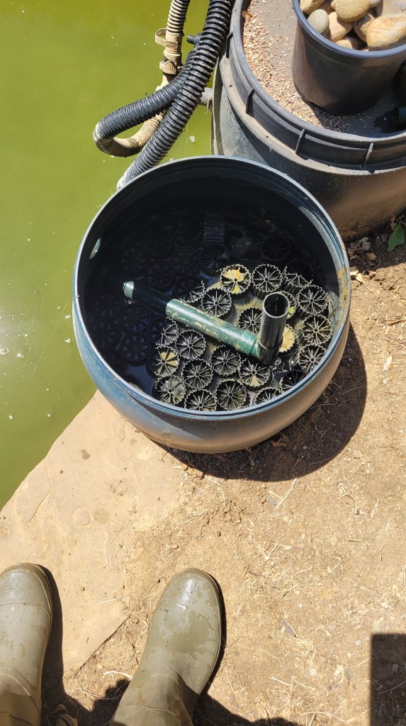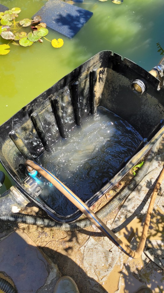 My backyard pond has three biofilters that I connected to a single water pump in a Frankenstein like fashion with pipes everywhere. It works for my purposes and keeps the fish from poisoning themselves, but the main issue is sludge build up if I don’t clean it out. So I did.